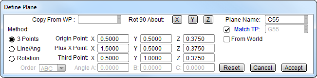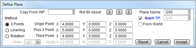Workplane Manager - New Plane: For the second fixture, again check Match TP. Match TP ensures that the Tool Plane is aligned with the workplane. The SmartCAM Code Generator uses the Tool Plane, not the Workplane for dimensional output. The Workplane name is used as an identifier, or name, in the Code Generator. The second fixture is called G56.