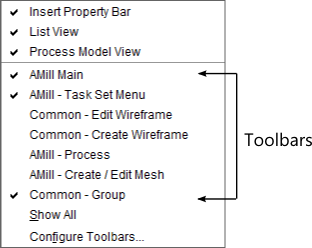 Right-clicking on the Main Menu bar opens a pop-up menu that contains a list of the Toolbars associated with the open Set file. Clicking on an item enables and disables visibility. Toolbars that are displayed have a checkmark next to them.