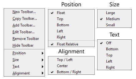 The Text menu turns on or off descriptive text for the Toolbar icons. If enabled, it also lets you select where to display the text: above, below, to the left, or the right of the icon. Finally, the Alignment menu lets you set the alignment for the icons. They can be justified to the Top/Left (Top for vertical, left for horizontal Toolbars), Bottom/Right, or centered in middle of Toolbar.