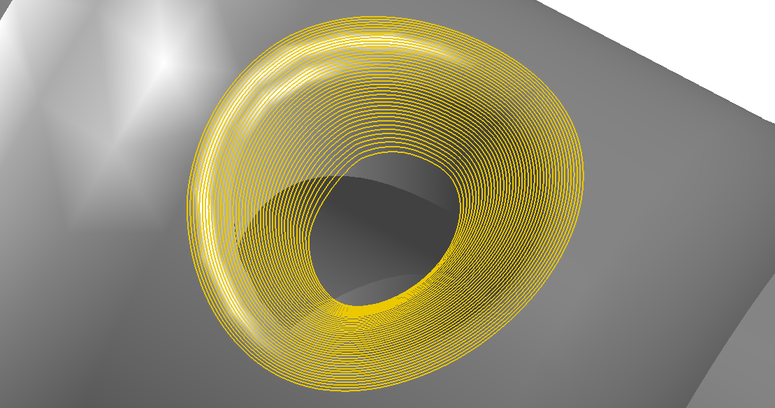 Toolpath is created for all possible profiles at each Z level depth of cut. Options for zig‑zag or one‑way toolpath with plunge moves are available. The toolpath can be constrained to a Z‑level start and Z‑level end. Contour toolpaths are useful for semi‑finish and finish machining curved vertical and near vertical walls, with or without islands and bosses, in mold cavity and core models. Ball, bull, flat and tapered cutter types are supported. The Contour process can also be used to create planar profiles that are suitable for use in the Region Rough process.